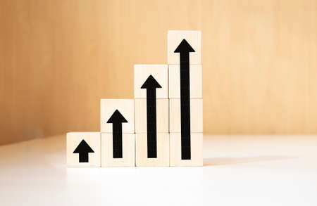 Multiple small, square, wooden blocks are arranged in a row against a light blue background. Each block has a simple upward-pointing arrow symbol etched into its surface. One block is a different color, yellow. The image evokes a concept of growth, progress, or strategy.