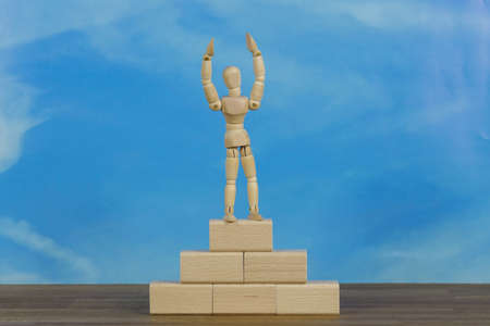 Career growth, development. Leadership, goal achievement. Wooden people figures on top of wooden blocks