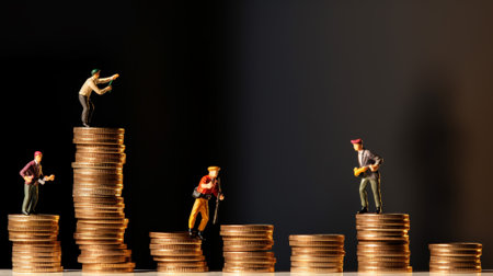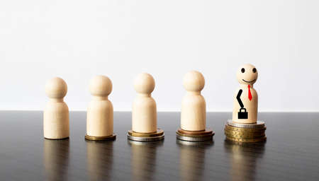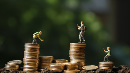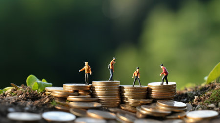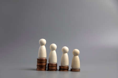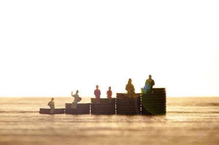 Miniature people standing on piles of different heights of coins. The concepts of person and wealth. investment and teamwork growth