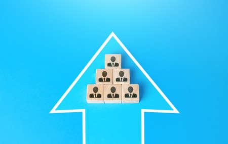 Blocks with people united in a single move arrow. Consolidation for a common goal. Organization cooperation. Strength in unity, teamwork. An effective team focused on getting things done.