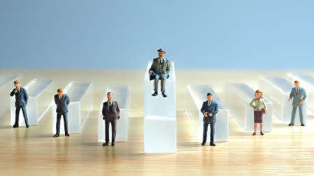 conceptual businessman figures with clear blocks, standing in the leader position among other businessmen indicating his succesful, achievment, strategy, planing and prevention.