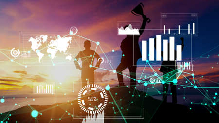 Achievement and Business Goal Success conceptual - Creative business people with icon graphic interface showing employee reward giving for business success achievement.