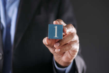 Miniature people : Businessman sitting on wooden blocks with sequential numbers. Image use for business concept.