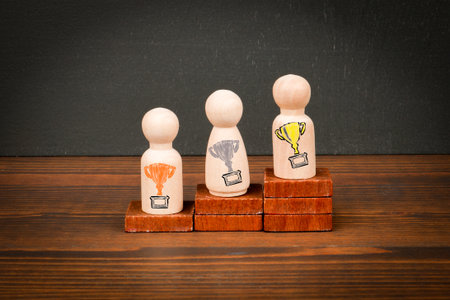 Wooden Figures on Podium Representing First, Second, and Third Place with Trophy Symbols