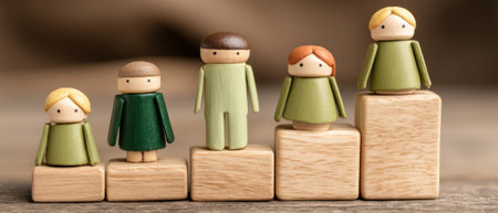 Wooden figurines stand on blocks symbolizing growth and unity in a cozy home environment.
