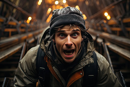 Portrait of a crazy man screaming in the park. Outdoors