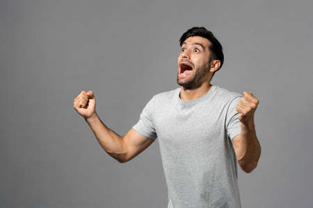 Delighted Caucasian man in casual wear celebrating success with clenched fists while standing on gray isolated studio background
