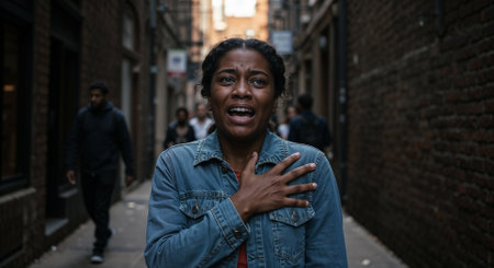 A Black woman in distress, struggling with a panic attack amidst a crowded urban street, visibly anxious.