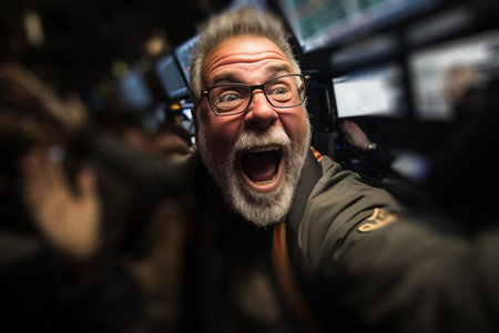 Portrait of a trader on the stock exchange, rejoicing at the rapid growth of shares. Concept of bullish trend in markets. To the moon
