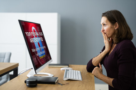 African American business woman gets stressed from seeing a sign on computer screens that her personal files are encrypted. Concept of virus, fraud, information leakage and computer hacking.