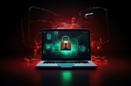 Importance of cyber security. laptop on modern office desk with red glow and padlock screen