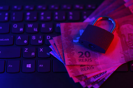 Closed padlock with brazilian reais money bills on laptop keyboard close up. Safe online banking or online shopping concept in Brazil