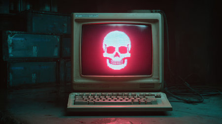 Vintage computer with glowing skull graphic on screen in dark, moody environment representing cyber danger and digital threats in retro style