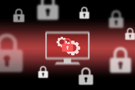 A computer screen view of cyber crime detection with a sudden appearance of data encryption lock warning sign.