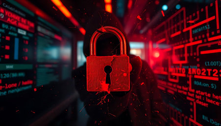 Digital security concept illustrating a cybersecurity breach, with a red unlocked padlock indicating data exposure among secure systems, emphasizing system vulnerability and risk Latch