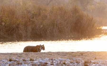 Female tigress (Panthera tigris) near river at jim corbett forest.