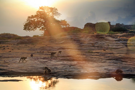 India Badami. Monkey at a watering place on a background of a Hindu temple at sunset