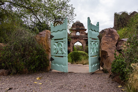 artistic entrance gate of hiking trails at evening from different angle image is taken at rao jodha park mehrangarh fort jodhpur rajasthan india.