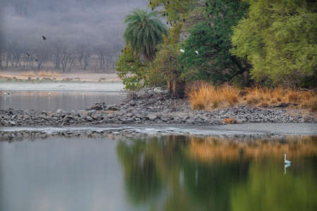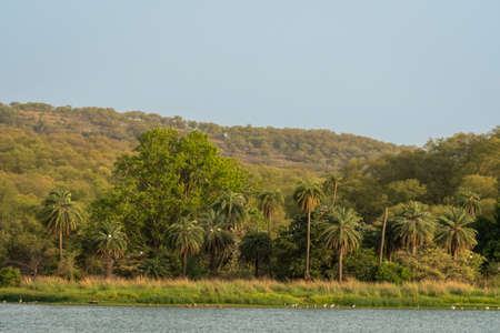 natural scenic landscape view of rajbagh lake green palm trees and in background hills or mountains at ranthambore national park forest tiger reserve sawai madhopur rajasthan india asia