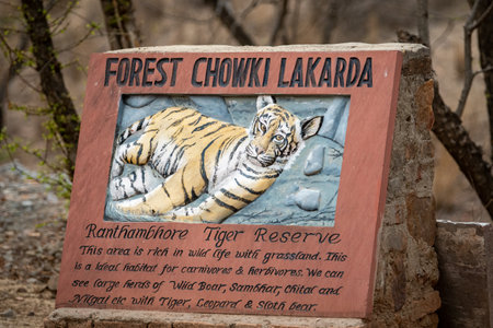 ranthambore national park, rajasthan, India - April 29, 2017 - sign board of forest chowki lakarda at ranthambore tiger reserve