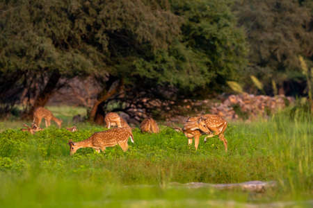 spotted deer or chital or axis deer herd or family in wild natural green scenic background in monsoon season outdoor wildlife safari at ranthambore national park forest rajasthan india - axis axis
