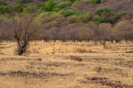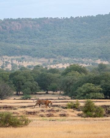 A wild male tiger patrolling his territory and on stroll in backdrop ranthambore hills. Habitat and landscape of dry deciduous forest with blue sky and hills of ranthambore national park, rajasthan, india
