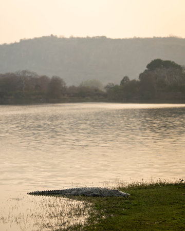 Marsh crocodile or mugger crocodile or broad snouted crocodile Crocodylus palustris out of lake water in natural scenic background in summer season at ranthambore national park forest rajasthan india