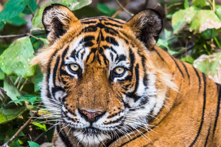Tiger lying in green vegetation. Wild Asia, wildlife India. Yiung Indian tiger, wild animal in the nature habitat, Ranthambore, India. Big cat, endangered animal hidden in forest. End of dry season.