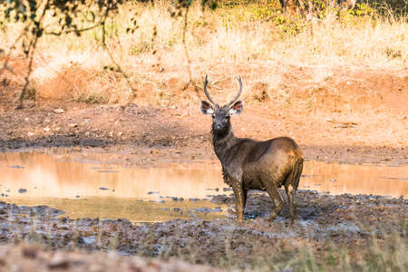 Stag sambar deer (Rusa unicolor) drinking water in the Ranthambore National Park, India