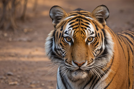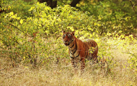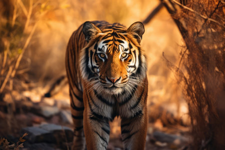 Male tiger standing head on during evening safari to ranthambore national park or tiger reserve, rajasthan, india - panthera tigris