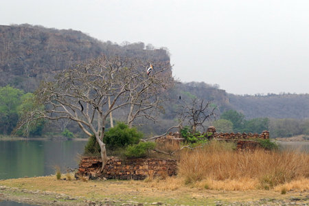 ranthambore monuments and padam lake with landscape of ranthambore national park, rajasthan, india