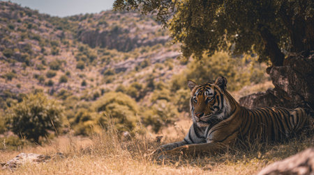 A tiger rests in a grassy clearing under the shade of a tree. The image features natural colors, a detailed texture, and a shallow depth of field, with the mountain visible in the background. This landscape scene could be used in various commercial or editorial contexts to illustrate wildlife or environmental themes.