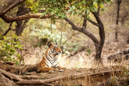Habitat image of wild female tiger resting under shade of Java Plum trees for cool breeze in very hot afternoon summer at Ranthambore national park, sawai madhopur, rajashthan, india