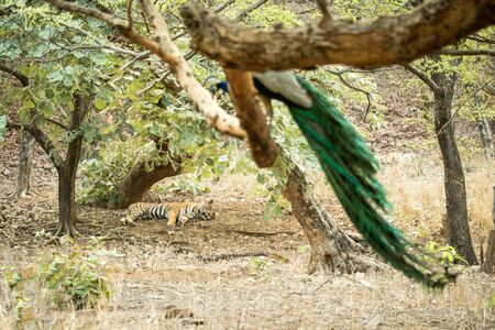Wild Bengal Tiger (Panthera Tigris Tigris) having rest sleeping during hot day under tree in its natural habitat,peacock pearching on branch.Ranthambore National Park, Rajasthan, India, lazy big cat