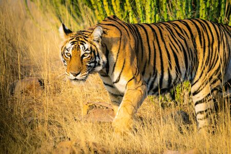 headon image of Wild male tiger (panthera tigris) on evening stroll and territory marking at summer safari in dry deciduous forest of Ranthambore National Park, Rajasthan, India