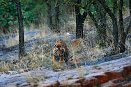 Indian tiger, wild danger animal in nature habitat, Ranthambore, India. Big cat, endangered mammal, nice fur coat. End of dry season, monsoon. Bengal tiger walking in old dry forest. Hidden in forest.