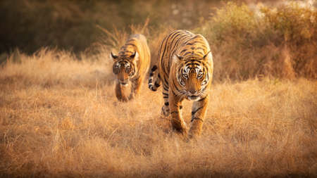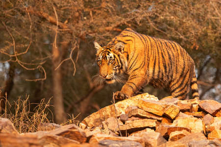 Royal bengal tiger in the nature habitat. Tiger pose during amazing light. Wildlife scene with danger animal. Hot summer in India. Dry area with beautiful indian tiger. Panthera tigris tigris.