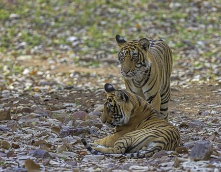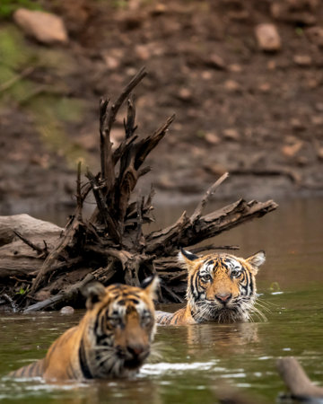 Wildlife scene of tigress and her cub. Angry looking female bengal tiger and her cub with face expressions near water body during summer safari in dry deciduous forest at ranthambore national park, rajasthan, india