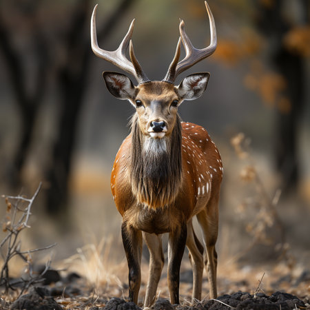 Male Sambar deer or Rusa unicolor head on with long horn or stag with an eye contact at ranthambore national park or tiger reserve, rajasthan, india