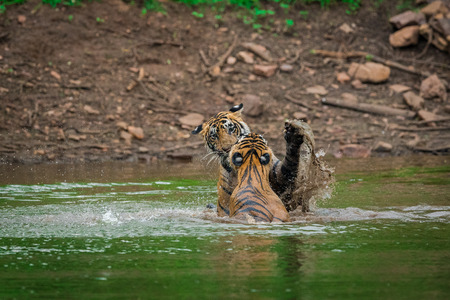 tiger cubs learning skills by fighting with each other at ranthambore national park, india