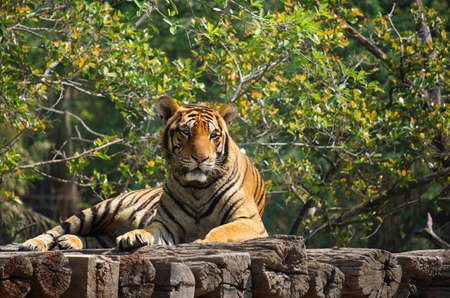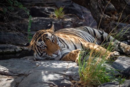 Wild Bengal Tiger (Panthera Tigris Tigris) having rest during hot day in its natural habitat.Ranthambore National Park, Rajasthan, India, endangered species, big beautiful cat