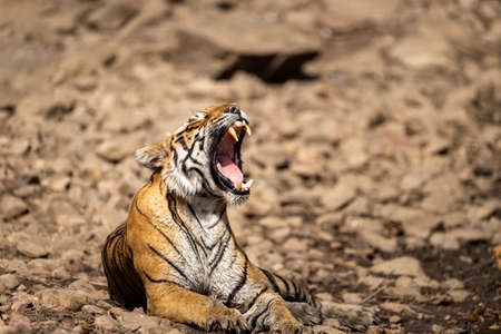wild bengal tiger resting on rocks and taking yawn at ranthambore national park or tiger reserve sawai madhopur rajasthan india - panthera tigris