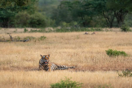 Indian wild fully grown royal bengal male tiger in open field in morning safari at ranthambore national park or tiger reserve rajasthan india - panthera tigris tigris