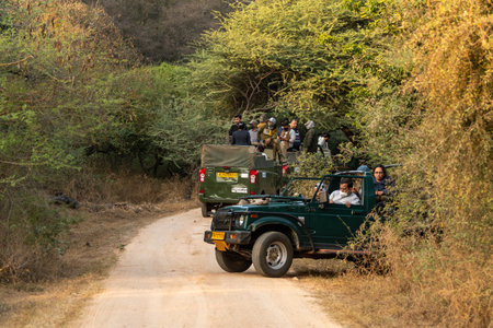 jaipur, rajasthan, India - december 04, 2021 - safari on ev or electric vehicle and gypsy to explore wildlife and tourists are waiting for leopard sight at jhalana forest reserve