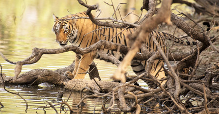 Wildlife scene of dry deciduous forest of central india. After territory marking and morning stroll this Female bengal tiger quenching her thirst with blue lake water of rajbagh talao at ranthambore national park, rajasthan, india (panthera tigris)