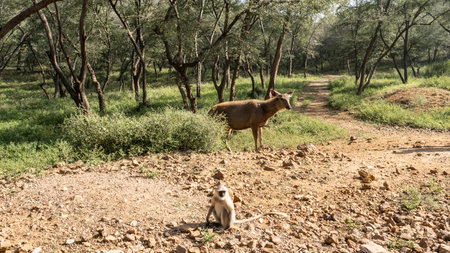 Wild animals came to the side of a dirt road in the jungle. Langur monkey is sitting on stoney ground. Indian deer sambar Rusa Unicolor stands in the grass. green trees. India.