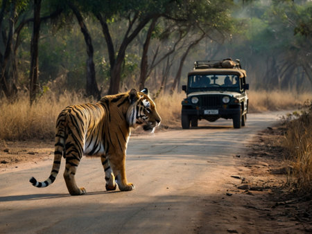 Tiger walking on the road in Ranthambore National Park, India