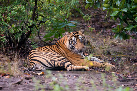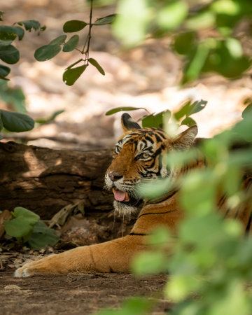 A male tiger cub relaxing in nature at ranthambore tiger reserve, India