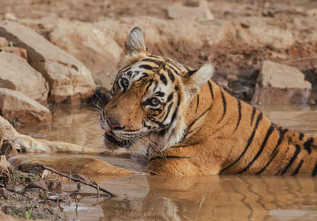 Royal bengal female tiger resting near water body of the jungle. Animal in forest stream near rock and hills. Wild cat in natural habitat at ranthambore national park, Rajasthan, india, asia