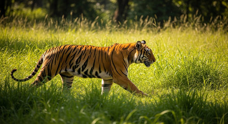 Ranthambore tiger or tigress walking in green forest for territory marking during morning safari. story telling Habitat image tiger walking in jungle of ranthambore national park, rajasthan, india